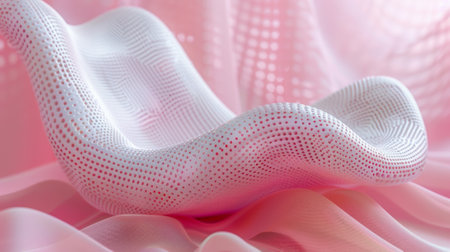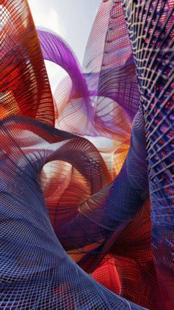 Abstract display of wire spirals wrapped with fabric, positioned upright to create a wave-like pattern against a bright background. Generative AI