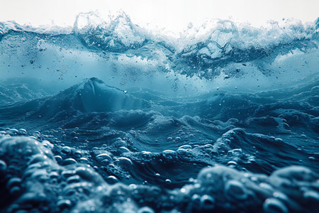 Underwater view of blue ocean wave with bubbles and splashes.