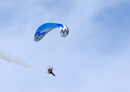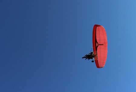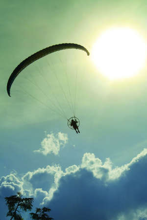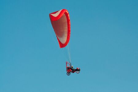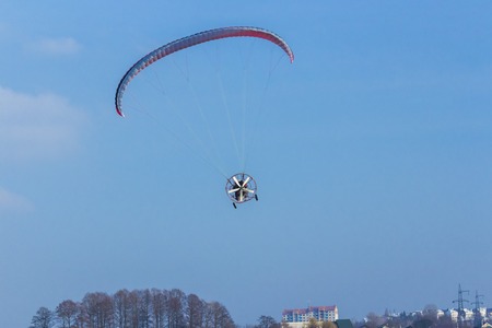 motorized paraglider flying in the blue sky