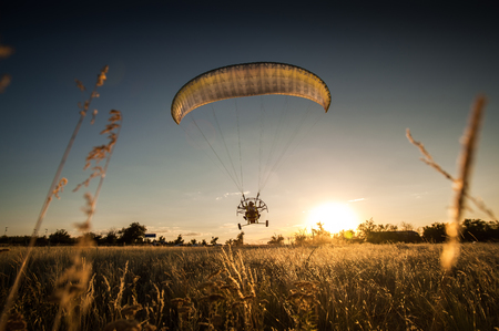 Paraglider flying with para motor on sunset background