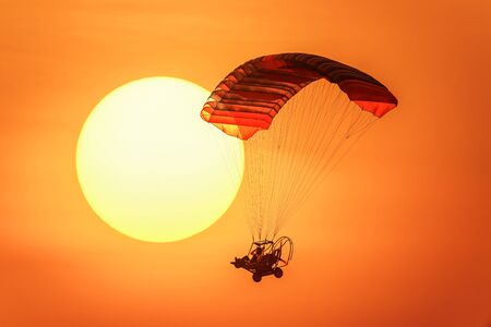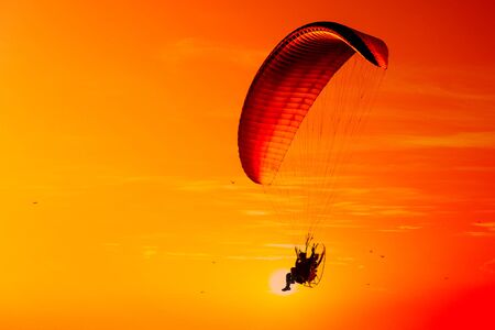 Silhouette of powered paraglider soaring flight over the sea against marvellous orange sunset sky. Paragliding - recreational and competitive adventure sport.