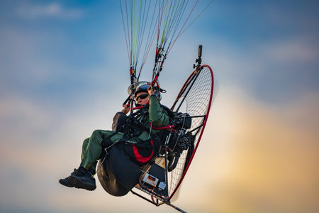 adventure man active extreme sport pilot flying in sky with paramotor engine glider parachute