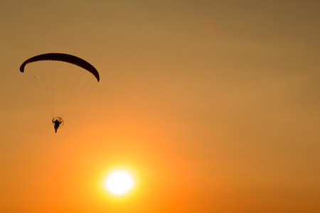 silhouette paraglider flying with paramotor on sunset