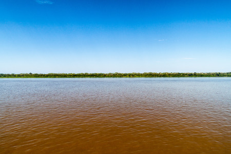 The Iguazu river flowing across the jungle in the frontier between Argentina and Brazil. The fresh water, shallows and green forest under a blue sky.