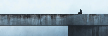 A lone individual sits at the edge of a fog covered bridge, deep in thought, with an air of solitude in the quiet twilight.