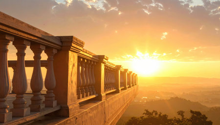 Captivating stone pillars bathed in the warm glow of sunset, showcasing intricate details and a scenic background, perfect for architecture-themed projects.