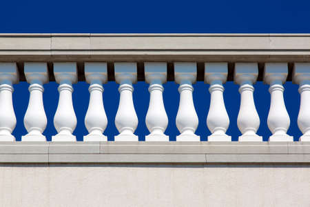 Baroque architecture details of stone railings with white balustrades close up against a blue sky.