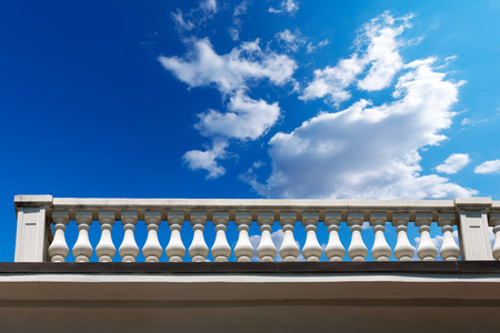 Old white stone balustrade with blue sky and clouds in the background
