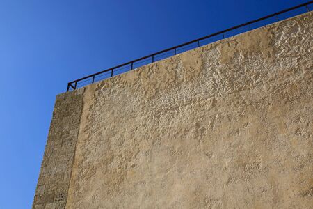 Beige color painted empty wall in contrast of clear blue sky background, texture. Copy space, ad template, low angle view.