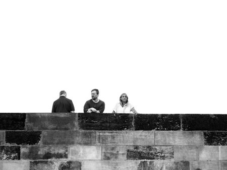 Prague, Czech Republic - June 2022:Abstract minimalist black and white picture with tourists on Charles Bridge in Prague