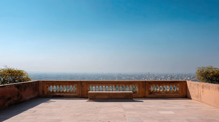 A tranquil outdoor viewpoint offers a stunning vista over a vibrant cityscape under a clear blue sky. The peaceful scene features a stone bench, inviting relaxation.