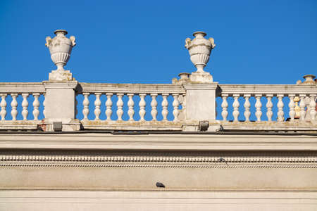 white stone balustrades over the wall architecture of the Baroque against the blue sky on a sunny day.
