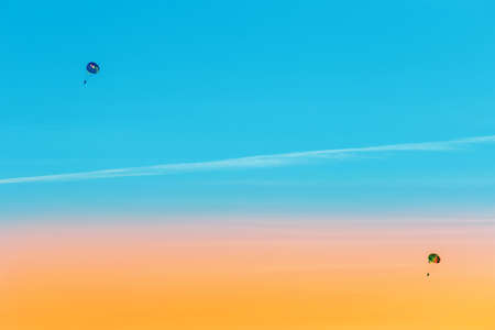 Extreme sports and exciting rest. Two tourists fly on a parashute in the blue sky and sunset background.