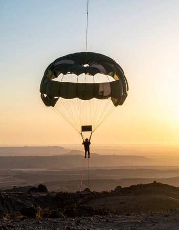 A lone skydiver is silhouetted against a breathtaking golden sunset, gliding peacefully towards the earth. This image captures the ultimate feeling of freedom, adventure, and the serene beauty of a solo descent at dusk.