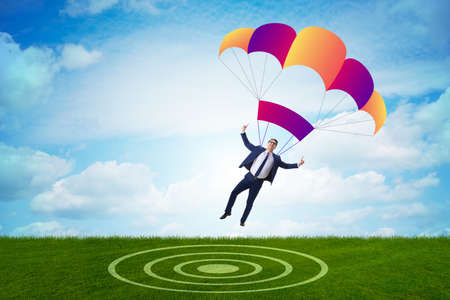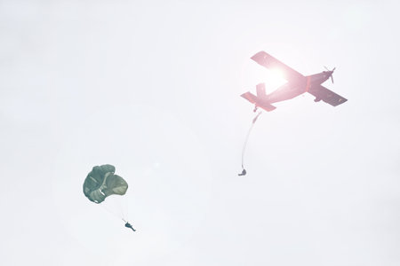 Skydiving activity theme. Man gliding on white parachute on blue sky background