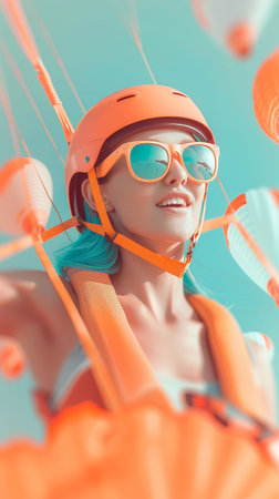 Adventurous Entrepreneur Parachuting, Intense Gaze. Close-up of an adventurous entrepreneur with reflective sunglasses parachuting, focused gaze against a blue sky.