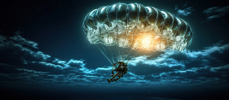 A Group of Parachutes Flying Through a Night Sky, Formation of special forces paratroopers descending from an aircraft in the night sky, AI Generated