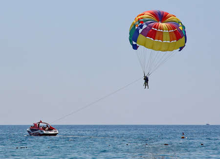 Side, Turkey - June, 26, 2017: Fly with colorful parachute at the beach