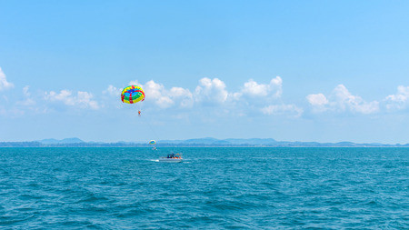Rayong, Thailand - October, 07, 2017 : Unidentified name tourist sea parasailing water.Flying on a parachute behind a boat on a summer holiday by the sea in Rayong, Thailand