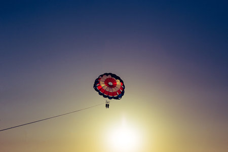 Parasailing in the evening sky near the coast of Vietnam. Orange color toned