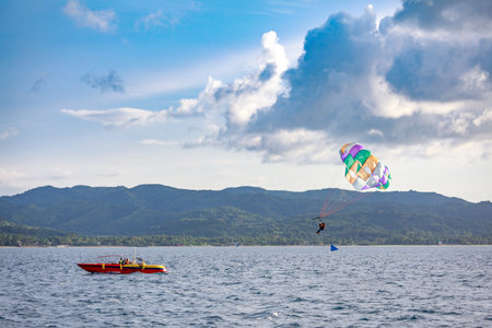 Boracay, Philippines - November 18, 2017 : Unidentified tourist doing parachute sailing recreational activity in Boracay Island, Aklan, Philippines