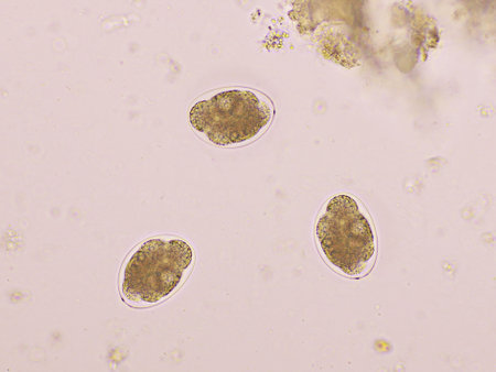 Egg of Ascaris lumbricoides (roundworm) in human stool, analyze by microscope, 400x