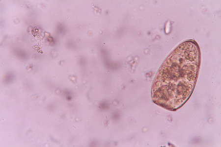 Egg of intestinal fluke in human stool, analyze by microscope, original magnification 400x