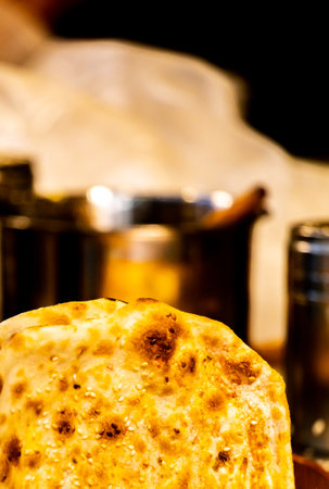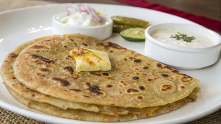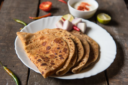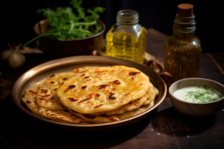 Aloo Paratha / Indian Potato stuffed Flatbread. Served with fresh curd and tomato ketchup. selective focus