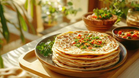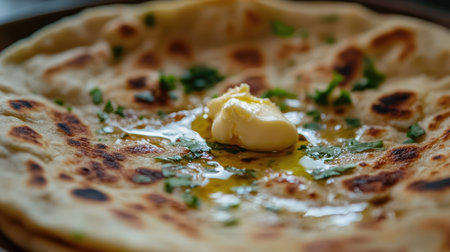This image features freshly made flatbread garnished with herbs on a rustic plate. Perfect for showcasing culinary delights or traditional meals.