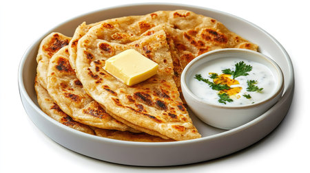 Top view of aloo paratha served with butter and curd, clean white background, no people, copy space