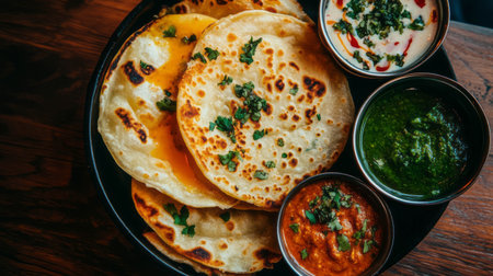 Crispy papadums with assorted chutneys and dips for culinary delight