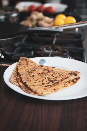 Triangle shape Plain Paratha or Parantha is yummy Indian flat-bread made of whole-wheat flour. served in a plate, selective focus