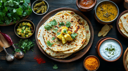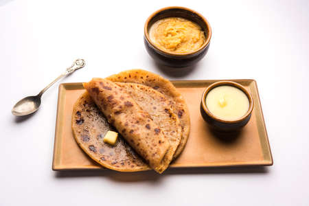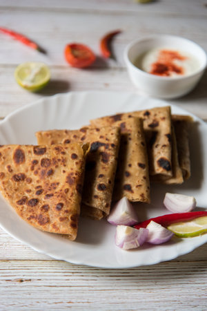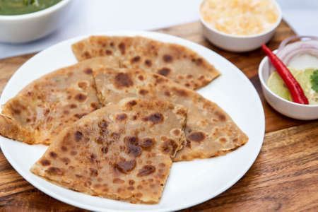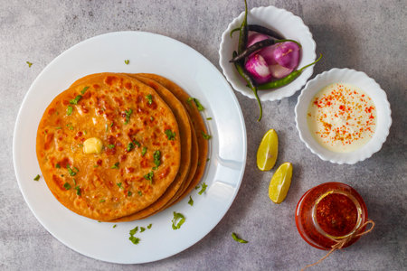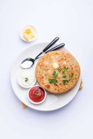 Traditional Indian food Aloo paratha or potato stuffed flat bread. served with pickle tomato ketchup and curd, butter, onion chili.