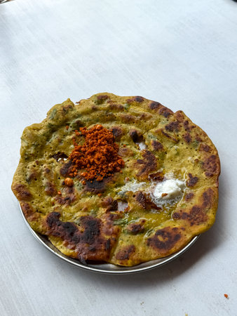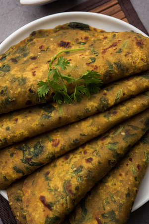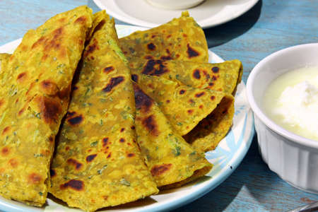 Methi Paratha,an Indian flatbread stuffed with fenugreek leaves and spices served in breakfast or brunch .