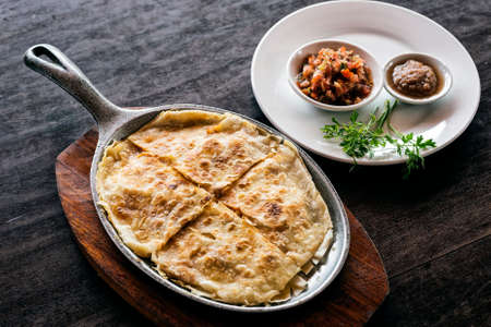 Azerbaijan national cuisine different kutabs with sauce on black plate close up.