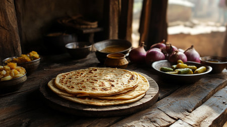 A cozy dining table set with various Indian dishes, with a stack of warm, fluffy rotis in the center, inviting guests to enjoy a delicious and communal meal.