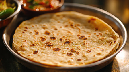 Detailed shot of a roti with a perfectly golden surface, placed on a traditional Indian serving dish with a side of pickles