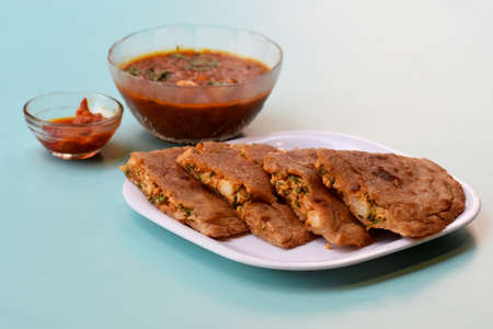 A set of kulchas stuffed with spicy paneer filling, served with tangy pickles.
