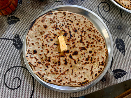 Top view of paneer paratha with butter, a popular breakfast for South Asian children