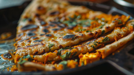 Close-up of a paratha bread stuffed with spicy paneer filling, showcasing the savory filling oozing out of the flaky layers, tempting viewers with its deliciousness.