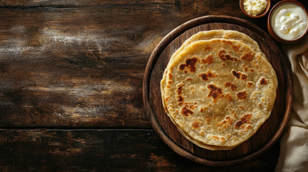 Flat lay of aloo paratha with butter and curd on the side, copy space on the left side.
