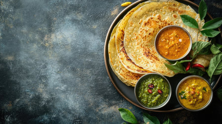 Aerial shot of a perfectly folded dosa accompanied by a variety of colorful sauces, set against a simple backdrop,
