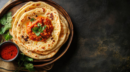 Sri Lankan coconut roti served with spicy sambol and curry. Copy space available.