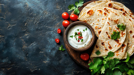 A vibrant display of fresh flatbread served with a creamy yogurt dip, garnished with herbs and cherry tomatoes, perfect for a healthy snack or meal.