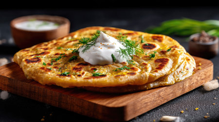This image features an enticing flatbread garnished with yogurt and fresh herbs on a rustic wooden plate. The golden-brown texture highlights its deliciousness, perfect for culinary presentations.
