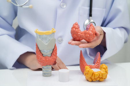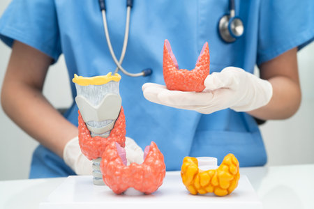 Doctor with human Thyroid anatomy model. Hyperthyroidism, Hypothyroidism, Hashimoto Thyroiditis, Thyroid Tumor and Cancer, Postpartum, Papillary Carcinoma and Health concept