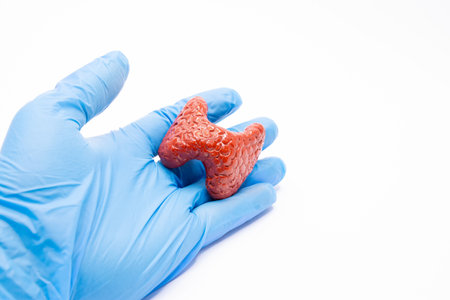 Human anatomy model of the thyroid gland in hand in medical glove on white background