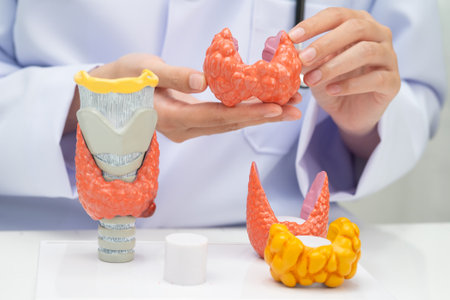 Models of thyroid anatomy on a wooden table with a person taking notes in a medical setting