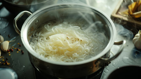 A vibrant image showcasing steaming noodles in a traditional pot, surrounded by an assortment of kitchen equipment typically found in a busy eatery.