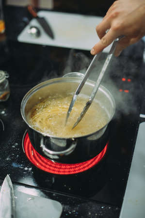 Hand with rice dry noodles and pan with boiling water on the kitchen. Cooking asian food